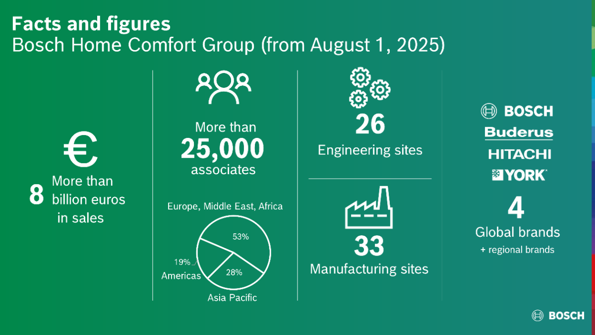 De Bosch Home Comfort Group heeft meer dan 25.000 medewerkers in dienst en heeft een sterke aanwezigheid op de markt in Amerika, Azië en Europa, het Midden-Oosten en Afrika, met een netwerk van 33 productielocaties en 26 ontwikkelingscentra in de hele wereld. Door de overname is de Bosch Home Comfort Group in omvang bijna verdubbeld met meer dan acht miljard euro omzet in 2025.